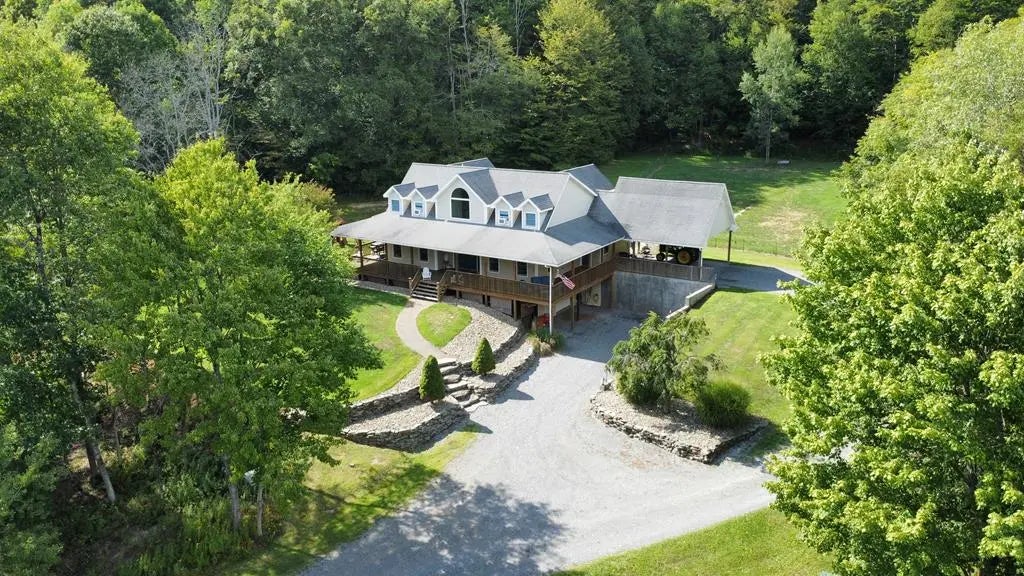 Charming 2-Story Cape Cod Home on 10 Acres in the Country Nestled on a serene 10-acre lot, this beautifully crafted 2-story Cape Cod home blends timeless charm with modern comforts. A picturesque wrap-around covered porch welcomes you into a thoughtfully designed layout featuring spacious living areas and elegant finishes throughout. Step inside to a stunning great room with soaring vaulted ceilings, expansive windows that bathe the space in natural light, and a breathtaking wood stairway with a balcony that overlooks the entire roomâperfect for gathering or simply enjoying the peaceful country views. The main floor boasts a private master suite complete with a large walk-in closet, an oversized walk-in shower, a sleek stand-alone soaking tub, and dual vanities for a luxurious retreat. The galley-style kitchen offers functionality and style with a generous breakfast island, ideal for casual meals or entertaining, and flows seamlessly into a separate formal dining room.